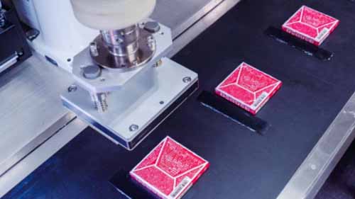 In this application, one robot arm picks up the product to be labeled and places it on a central surface. The second arm collects a label from a dispensing machine and places it on the product. The first arm then returns the labeled product to the tray and collects another until the whole batch is labeled.