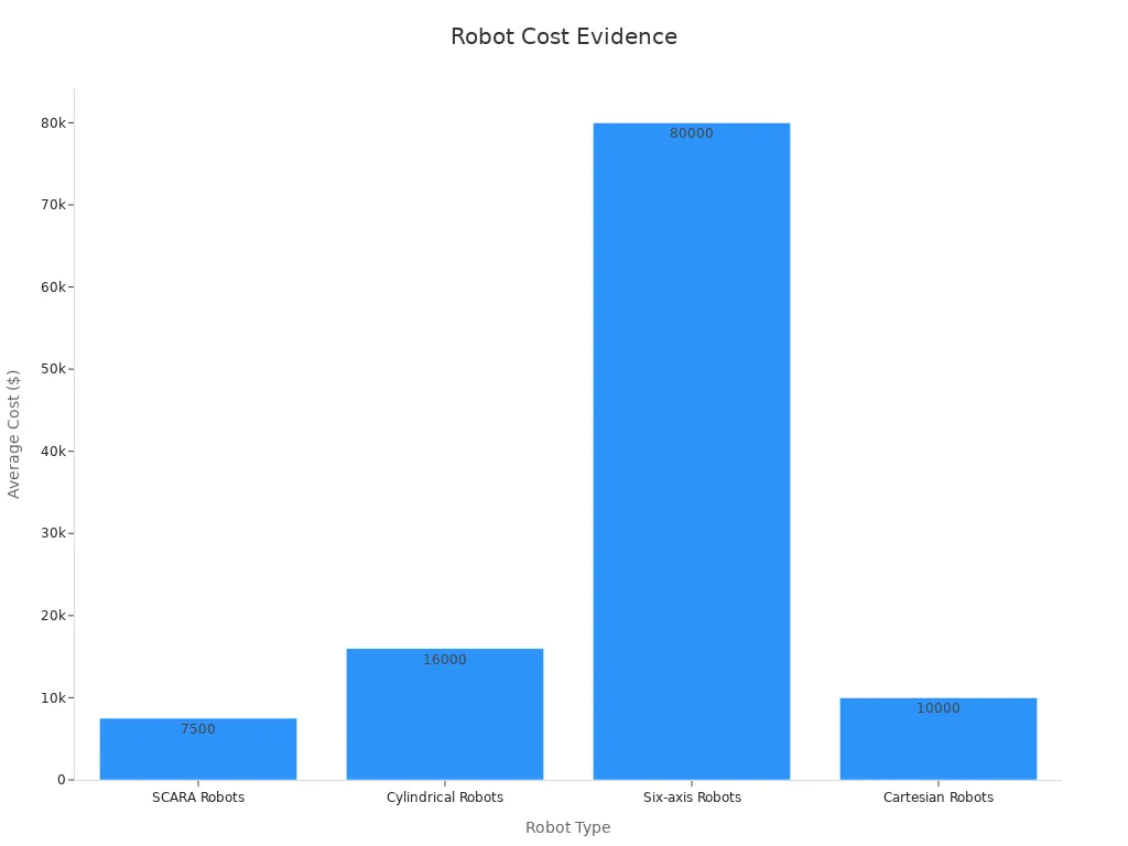 Different robot types have their own price ranges. SCARA robots usually cost about $7,000 to $8,000. Cylindrical robots are around $16,000. Six-axis robots are more flexible. They cost between $50,000 and $110,000. Cartesian robots are simpler and cost $5,000 to $15,000.