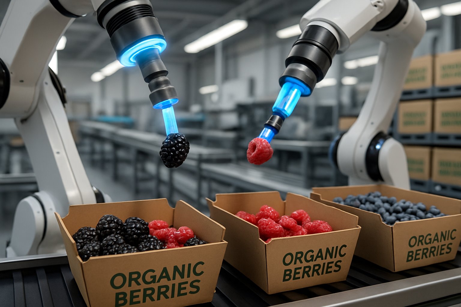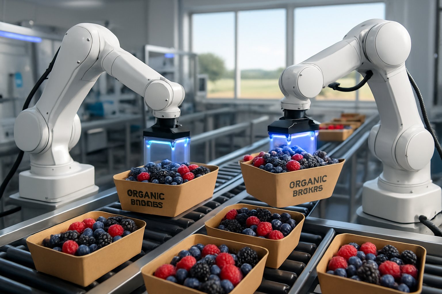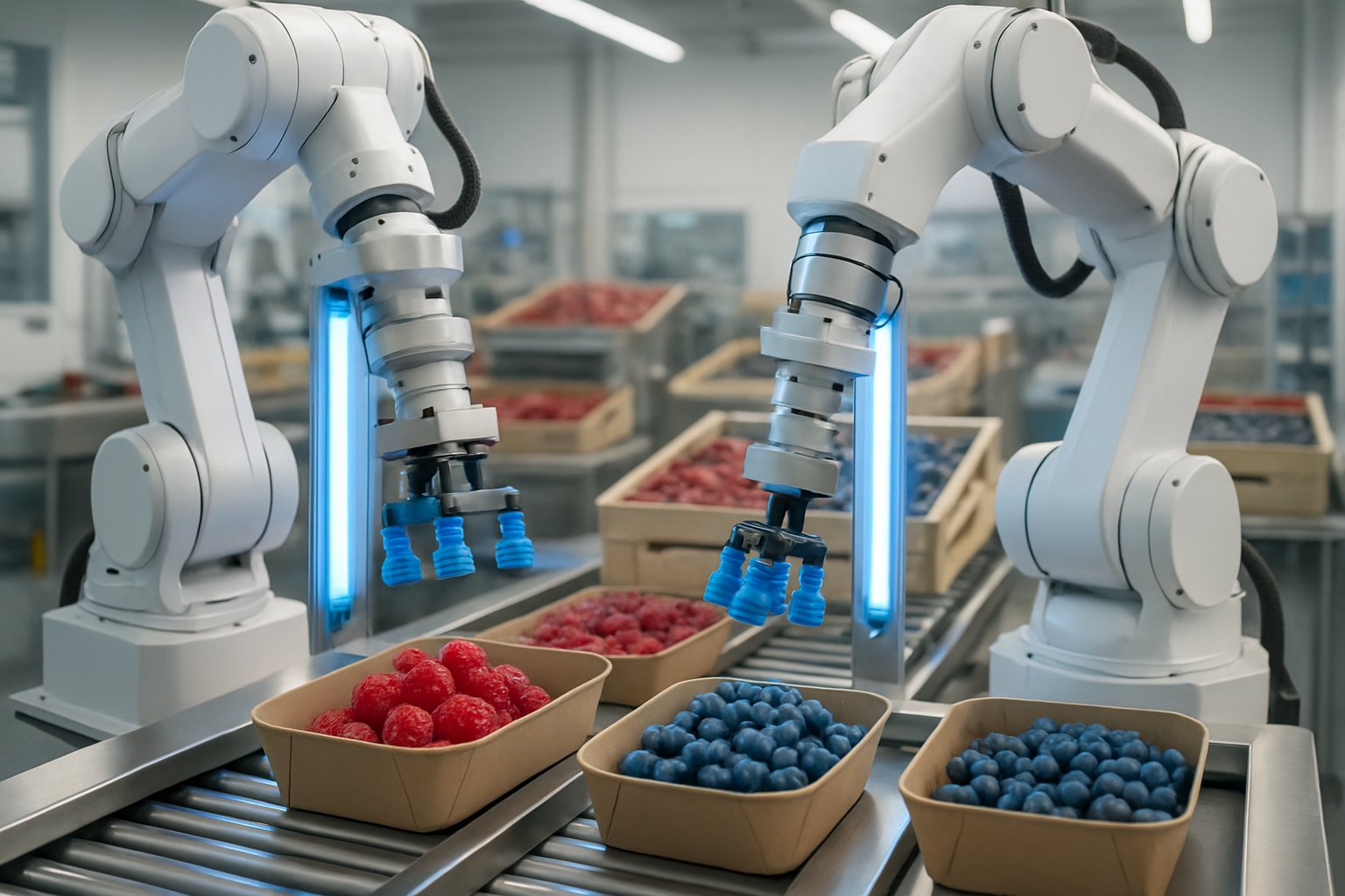 Agri-packaging robots with UV sanitation help keep organic berries cleaner while reducing bruising. These systems handle berries gently and support organic standards during export.