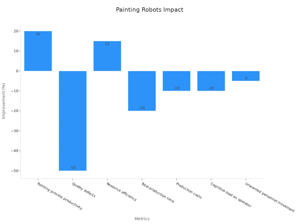 You see the automotive industry set the standard for automation in painting. Leading manufacturers use advanced robots to coat car bodies, bumpers, and wheels. You benefit from precise paint application, which reduces waste and ensures a flawless finish. In one major plant, robots with explosion-proof features operate safely in areas with volatile solvents. You avoid costly downtime and safety incidents. Your production line runs smoothly, and you meet strict quality requirements every day.
